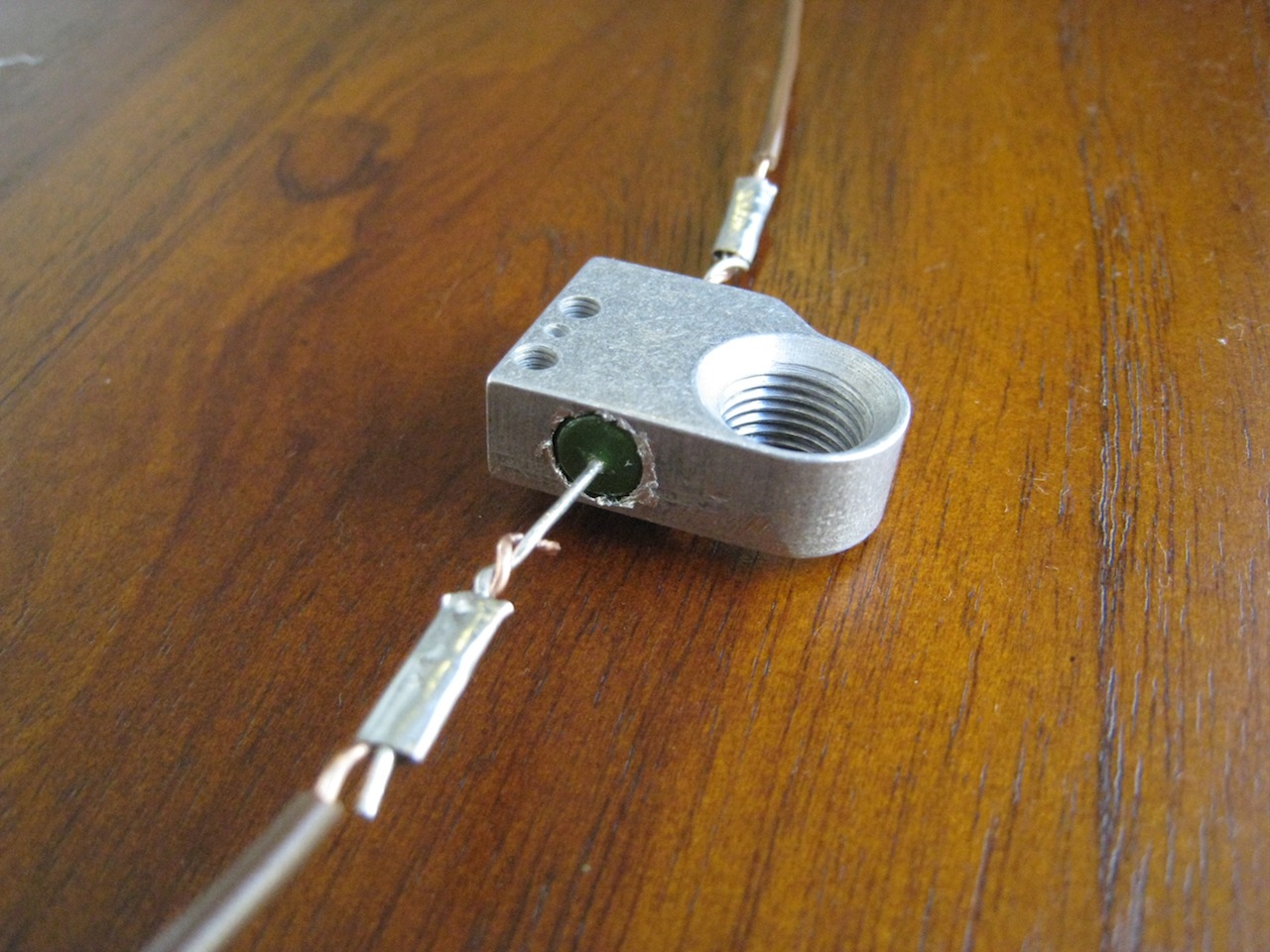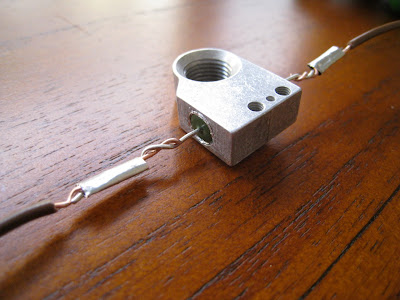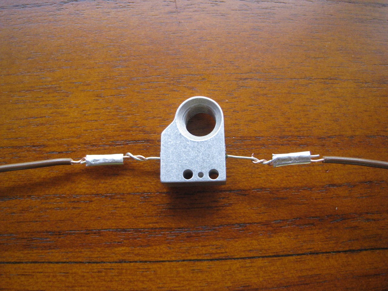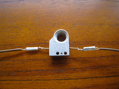 The biggest hassle with assembling the hot-end is trying to protect the thermistor. It’s quite fragile, and the arms can break quite easily. So naturally enough, you start off by wiring up the thermistor. The very thin connecting wires were quite fiddly to try and strip as well.