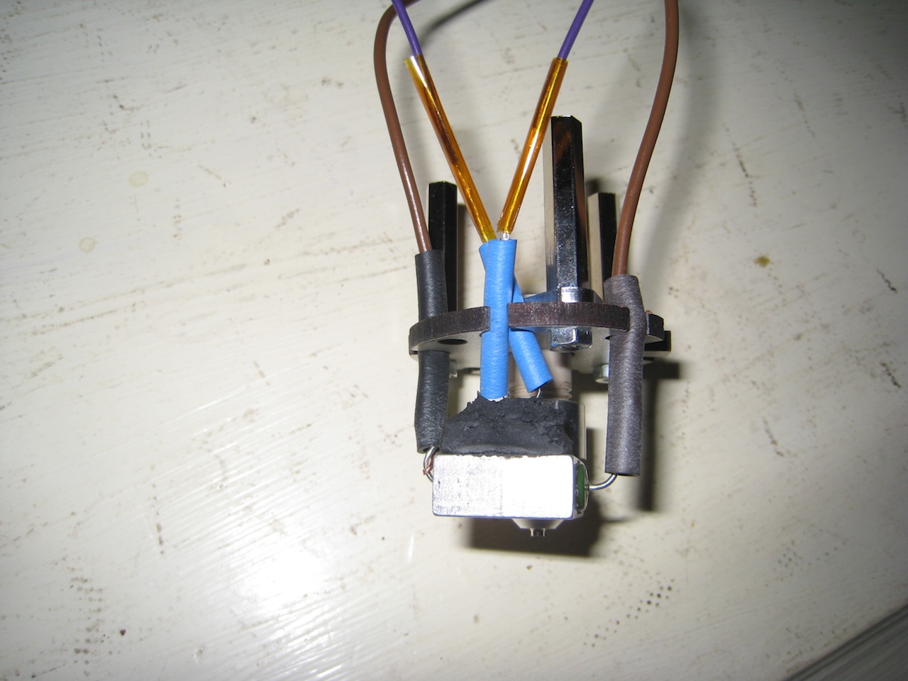The wires are protected with heat-resistant covers then the nozzle assembly is attached to the frame. The covers weren’t quite long enough to prevent the thermistor’s trailing leads from touching each other, so I wrapped some more Kapton tape around them to stop them shorting out.