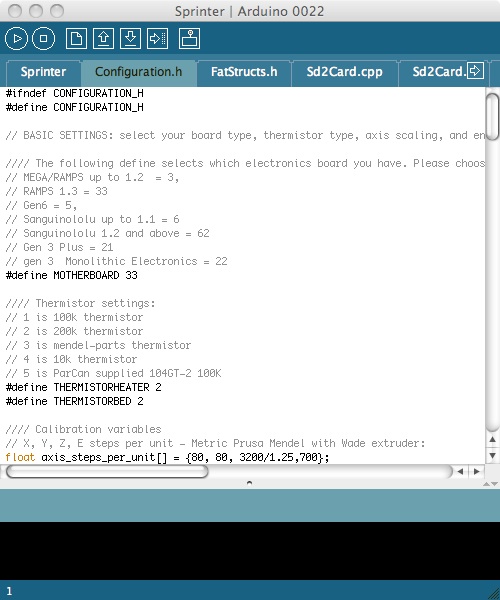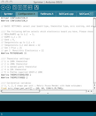 Downloading and installing the Arduino software from arduino.cc was extremely easy, as was downloading the Sprinter firmware. Once I opened up the sprinter.pde file in Arduino, the screen looked like this: