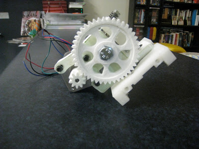 One very annoying thing with the build was that the M3x10 screws that are used to hold the motor to the frame in Wade’s no longer work. Unfortuately, I was out of 20mm screws, so I had to take three 20mm screws out of my Nophead’s Z-couplings, replace them with 25mm screws, and then use the 20mm to hold the motor on. Even worse, these didn’t work! With one washer in place, the screws bottomed out on the motor, leaving the motor loosely fitted to the frame. I had to add in a second washer in to make it fit correctly. This is definitely an area that could be improved with the extruder.