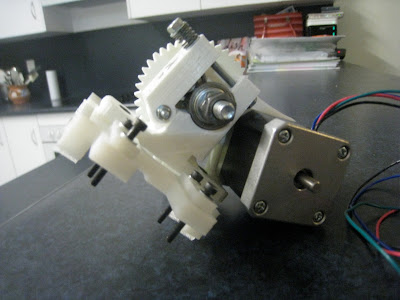 A major problem was with the hobbed bolt. The hobbing on the bolt I have is very narrow, only about 3mm wide, but it lines up perfectly on Wade’s Extruder. However, on Greg’s it was quite a way out. To make it fit, I had to put 3 washers between the big gear and the extruder, to push the hobbing across. Even then, it’s ever-so-slightly out of alignment, about 1/2 mm. Hopefully, this won’t cause any issues.
