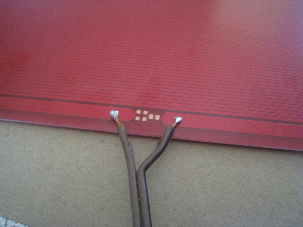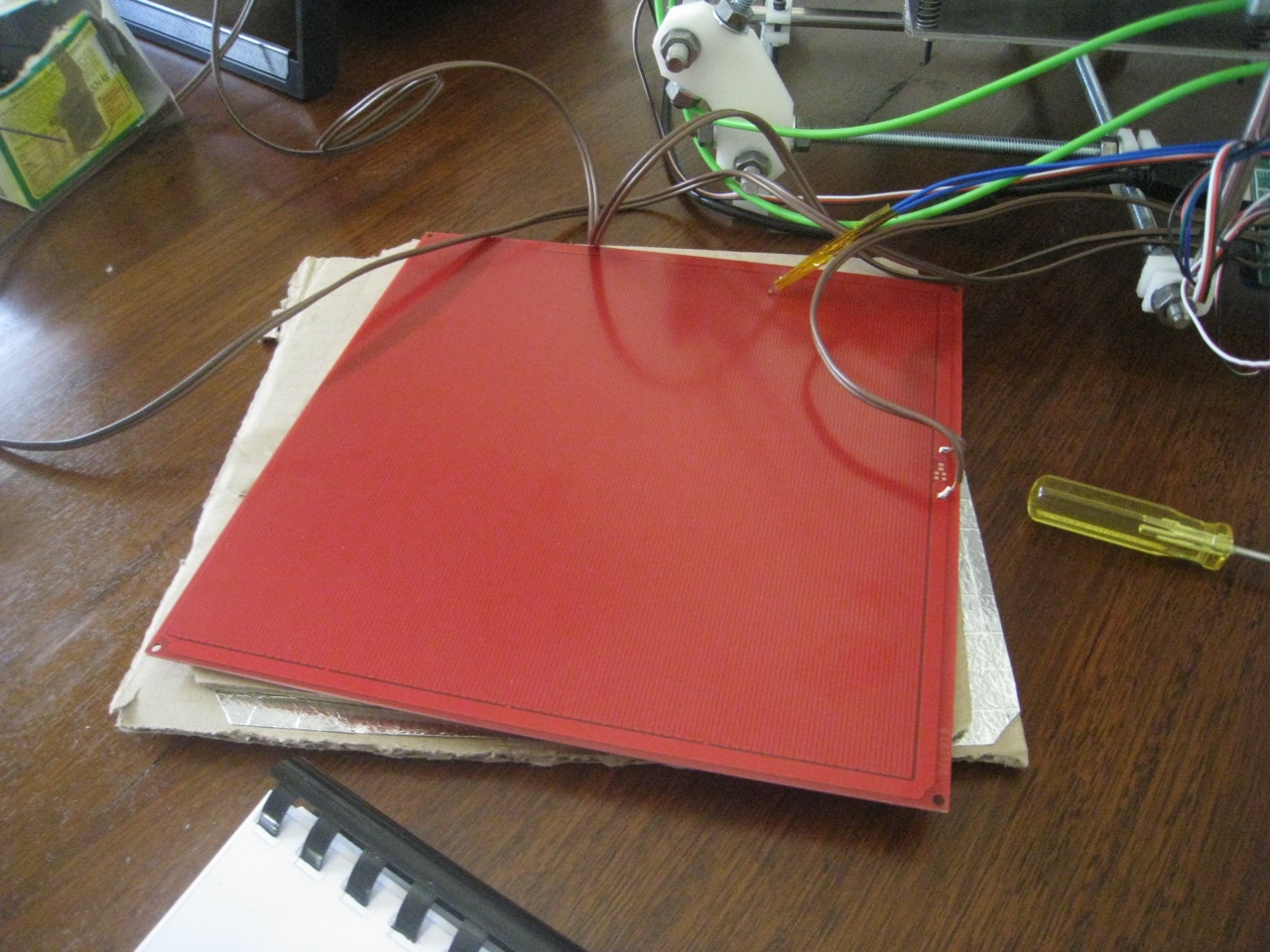 Once all the pieces were ready, I thought that I’d test the bed before screwing everything together. I wired it up, turned on Pronterface, then set the print bed temperature to 110 degrees. Right away the temperature started climbing on the bed. Sucess!