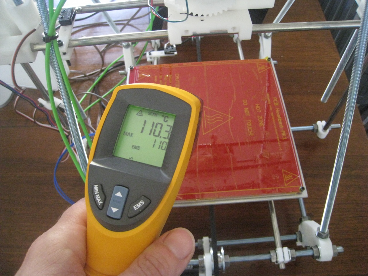 To check the temperature, I used both the thermistor and my IR gun. The thermistor generally showed a temperature about 10 degrees below that shown by the IR gun. At first I thought that I had the wrong thermistor in the firmware, but a quick check showed that it was ok. I then realised that the thermistor was cooling down too quickly in the open air.
