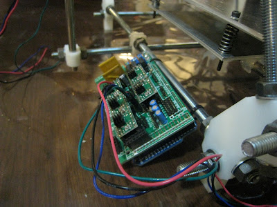 So I hooked up the power supply to the board, taking extreme care to make sure I get the polarity right on the cable. I then hooked up the motor to the extruder port, and then the electronics to the computer. I then put on one of the toothed gears on the motors, so that its movement would be clear.